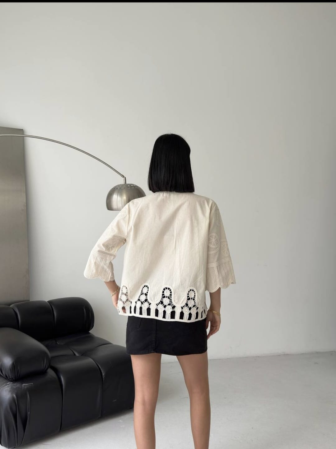El İşlemeli Nakışlı Keten Gömlek – Bej & Beyaz