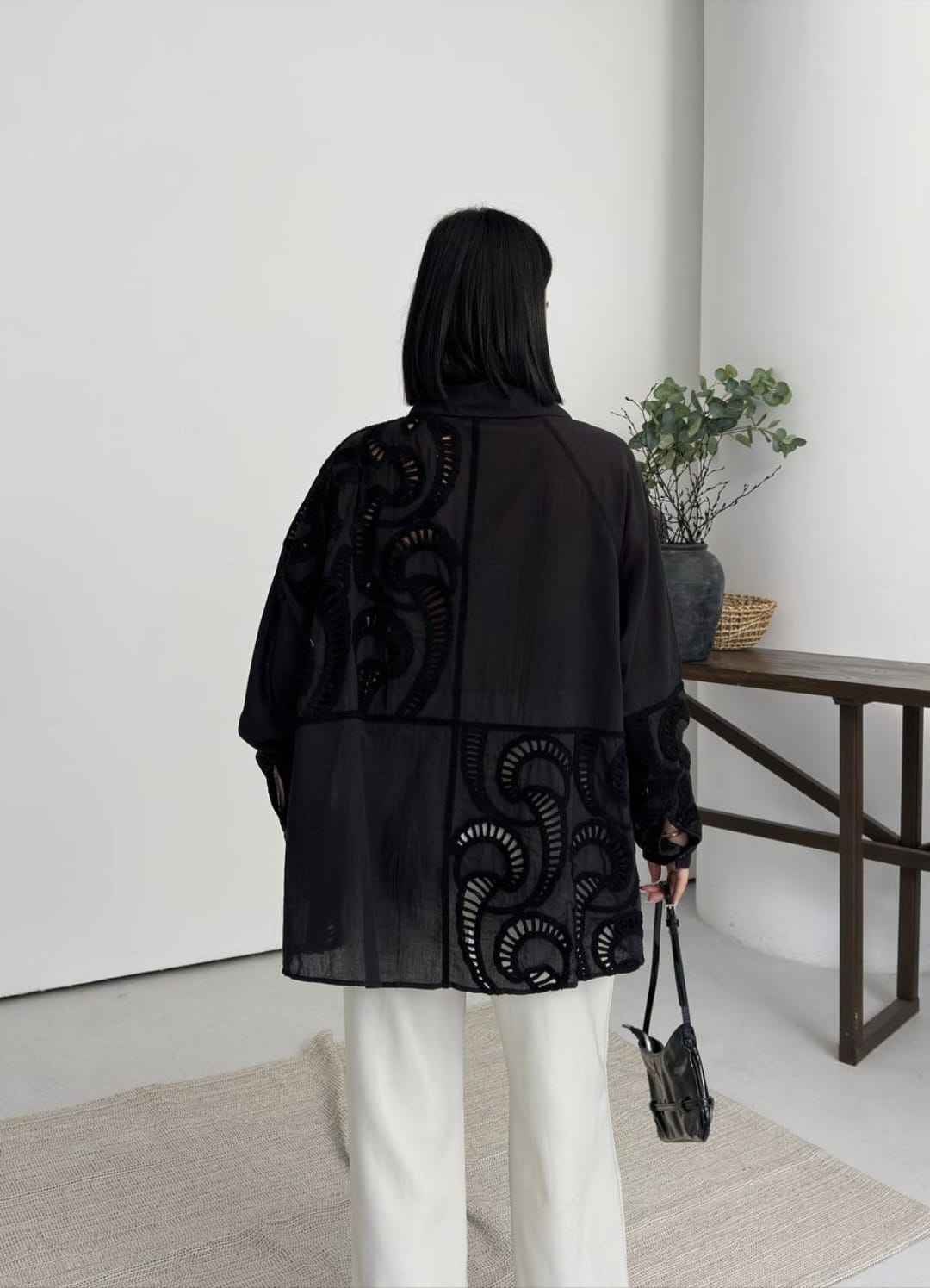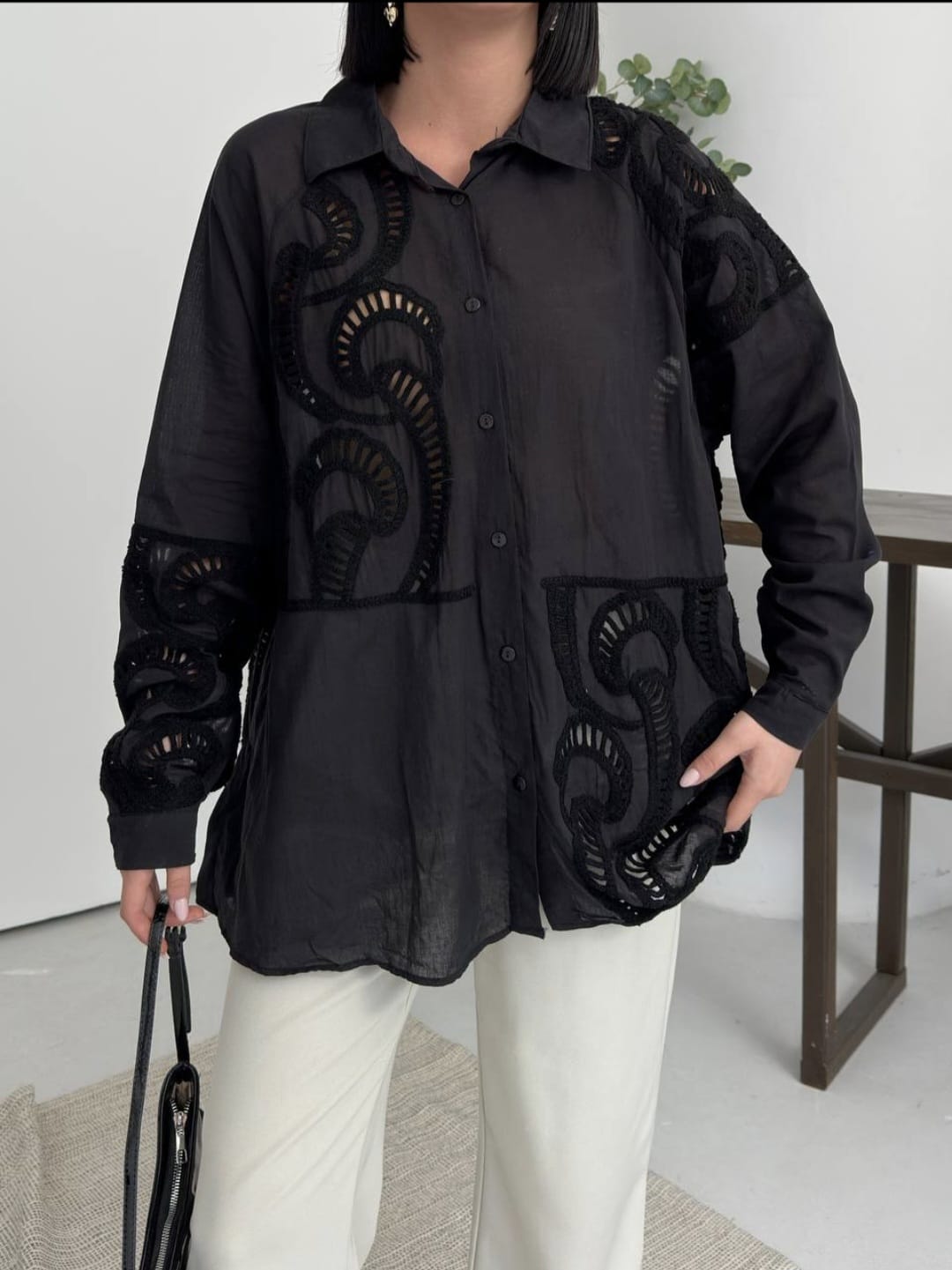 Nakışlı Keten Gömlek – Siyah & Beyaz